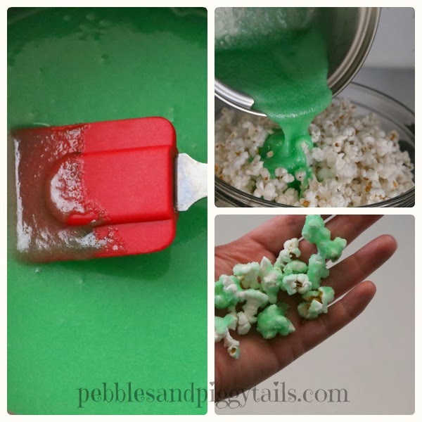 As soon as it boils, pour it immediately over your popcorn and stir it around until all the popcorn is covered. Let it stand a few minutes. The popcorn does not really stick together. It’s easy to separate.